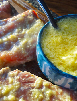 Stir in sour orange juice. (Five heads of garlic should be added to about 1 quart of sour orange juice to make a mojo for a whole pig.) Let sit at room temperature for 30 minutes or longer. Use immediately to season the pig or refrigerate for later use.